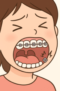 ワイヤーがずれたり、口の中で当たって痛い場合は、ワイヤーの先やブラケットにカバー材を一時的に当てて保護しておくと痛みが軽減します。