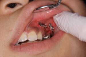 口腔外科で歯ぐきを切開し、埋伏歯の一部を露出させる